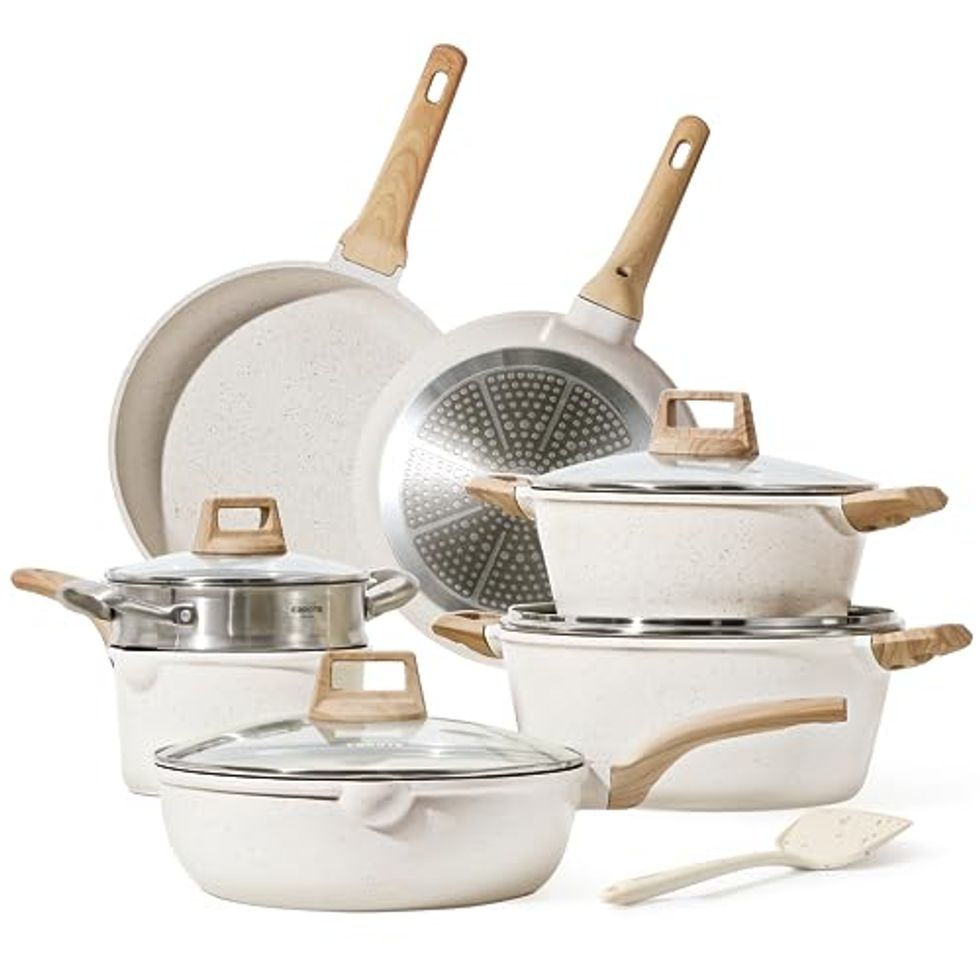 This remains one of the best-looking cookware sets we’ve ever seen, and it’s no surprise that people adore it. This easy-to-clean cookware set is suitable for all stove types, is made of nonstick granite material, and offers 12 pieces for all your cooking needs.