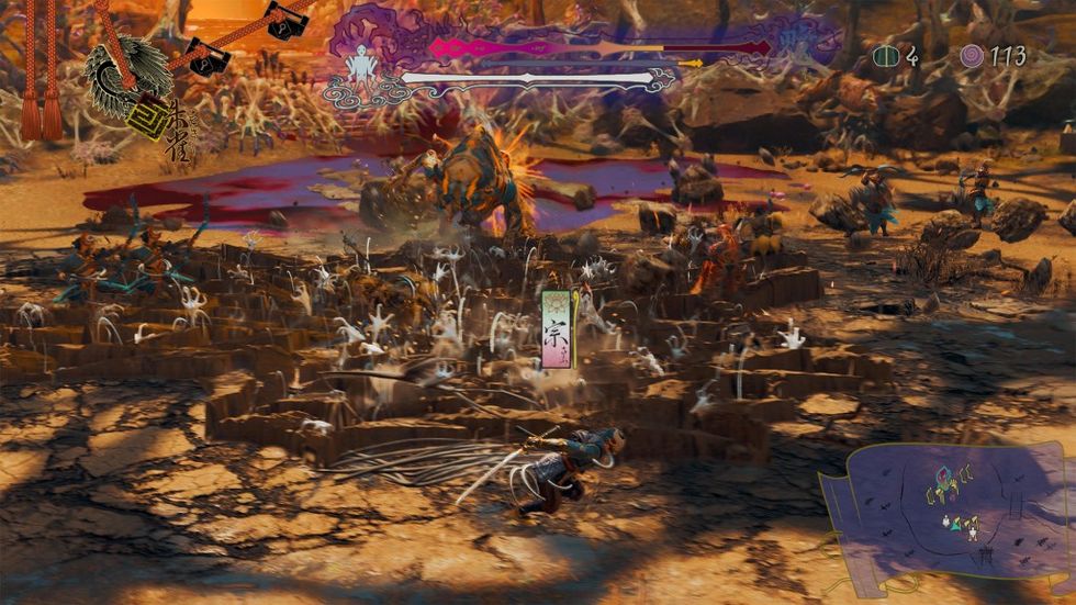 The mechanics can be hard to grasp at first. You observe Soh from a top-down view, controlling them like your usual hack-and-slash game. Villagers, on the other hand, act independently — you assign their positions on the map, as well as calling out some general direct orders, like all-out attacks during boss fights. They’re all quite competent, aside from a few odd cases where they can get stuck in environments.