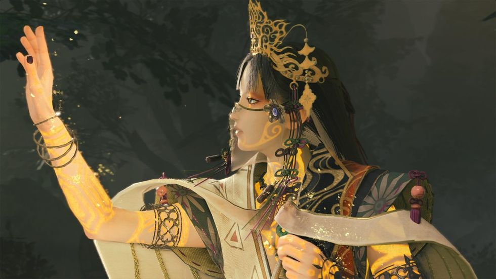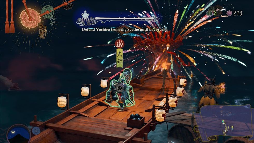 As gloomy as the ambiance of Kunitsu-Gami: Path of the Goddess can be, you’re constantly challenging it with a colorful celebration. Fireworks are a recurring motif, symbolizing the accomplished feats of your journey as you help cleanse villages and shrines from the threat of Yokai-inspired foes — supernatural entities and spirits in Japanese folklore. In combat, each time you set off a cannon, the impact turns the pale creatures into a splash of particles. Outside of it, fireworks are ever-present when you rebuild people’s homes, as townsfolk jump and scream in joy to see hope restored.