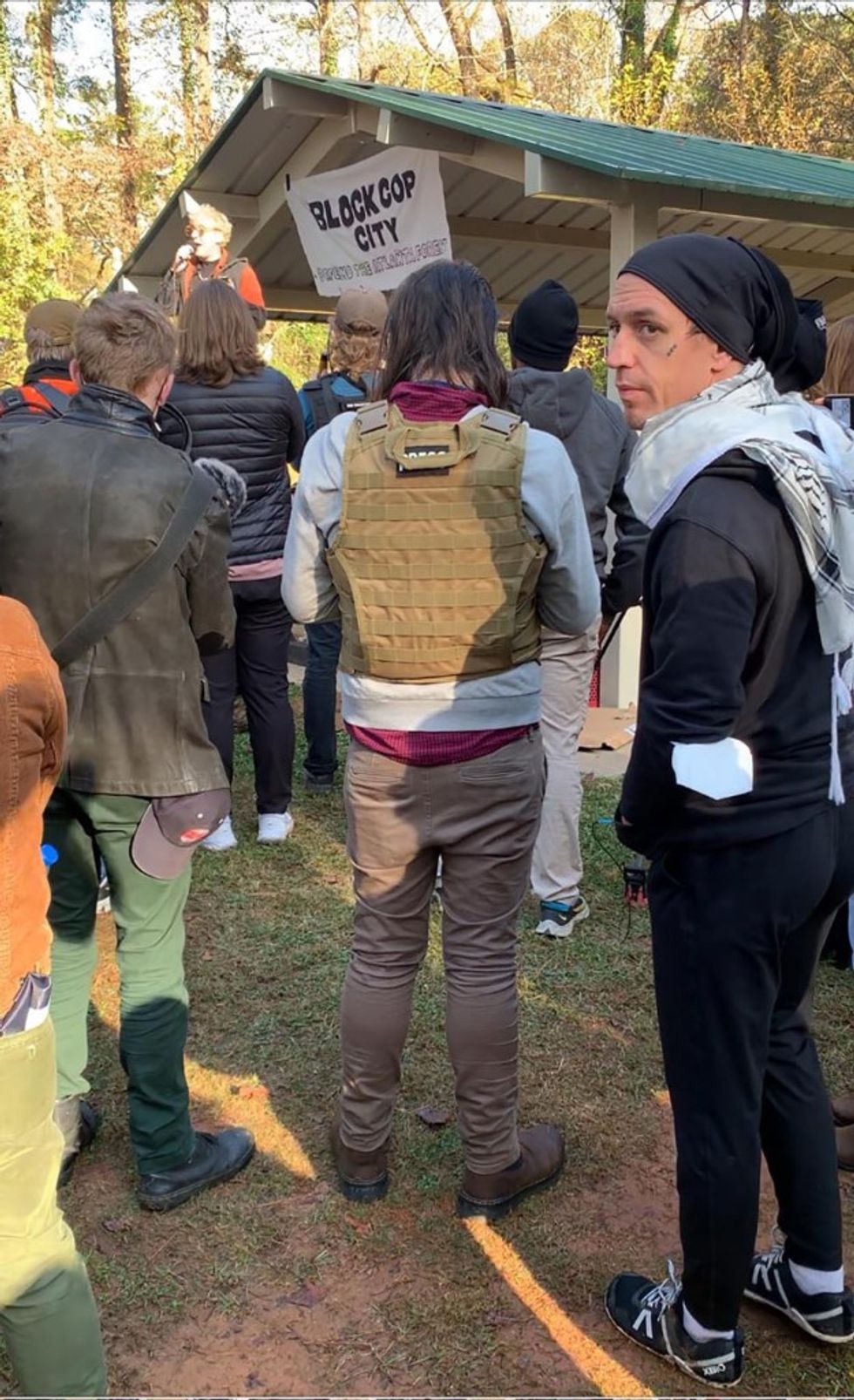 As we prepare to set off on a nearly two-mile march toward the Cop City site, the vibe in the park is very much a ragtag army division gearing up for combat. Organizers distribute goggles and face masks. Protesters check and recheck their equipment. Some have fashioned makeshift shields from plastic lunch trays. A small brass band plays “When the Saints Go Marching In.” Helicopters circle overhead.