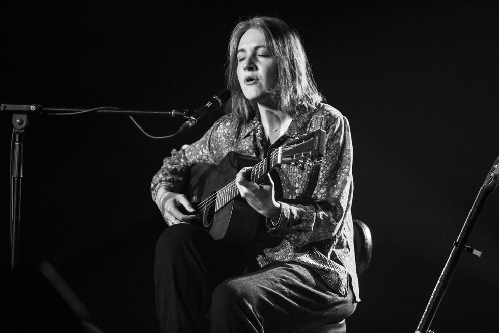 Assise seule sur la scène du chapiteau du Festival en chanson de Petite-Vallée, sa guitare acoustique sur les genoux, des pédales à ses pieds, Myriam Gendron entonne une pièce instrumentale tout en lenteur et en douceur, les yeux fermés. Il règne un silence monastique. Aucune lumière de téléphone en vue. Un véritable moment de communion se déroule entre l’artiste et son public, captivé.