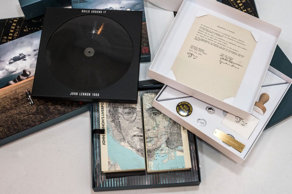 Mysteries present themselves at almost every turn as you unpack the contents, which come stacked like a Jenga tower. Two of the most curious items are large maps, designed by Ed Fairburn, of Liverpool in the Forties and Tokyo in the Thirties to show how Lennon and Ono grew up, playing off the opening lyrics to “You Are Here”: “From Liverpool to Tokyo.” The ultraviolet light reveals numbers that correspond to places of interest (Strawberry Fields Gate, Stu Sutcliffe’s flat) on a separate key, kind of like matching up faces on the cover of Sgt. Pepper’s. (And speaking of cover art, the way the Mind Games cover differs from record to record, with the cutout of Lennon in the foreground getting larger and smaller in the field is a nice touch. So is seeing the original photograph in which he stands in front of an Army recruitment poster, showing that since he cut that out of the image, he really didn’t want to get political this time.)