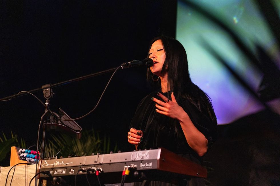 Central Presbyterian Church, which hosts shows when it’s not being used by its progressive downtown congregation, might be the single most beautiful venue in Austin. It’s always worth finding a show to see there during SXSW, and it made the perfect setting for a showcase of ambient-leaning and electronic music on Friday night. At 9 p.m., JFDR — a.k.a. Icelandic singer-songwriter Jófríður Ákadóttir — set a meditative tone with her cool synth tones and gorgeous, pleading vocals. At 10, Hinako Omori came out and asked the audience to turn our attention to Gaza. “It’s more important than ever for us to come together to pray for an end to war… in areas of conflict around the world,” said the London-based artist, who is making her first-ever appearances in the U.S. this week. Her set layered dreamlike melodies over softly looped arpeggios and gentle beats. At times she ran her vocals through filters, pitching her voice down to create a haunted effect. Her music felt like a balm for an injured world. —S.V.L.