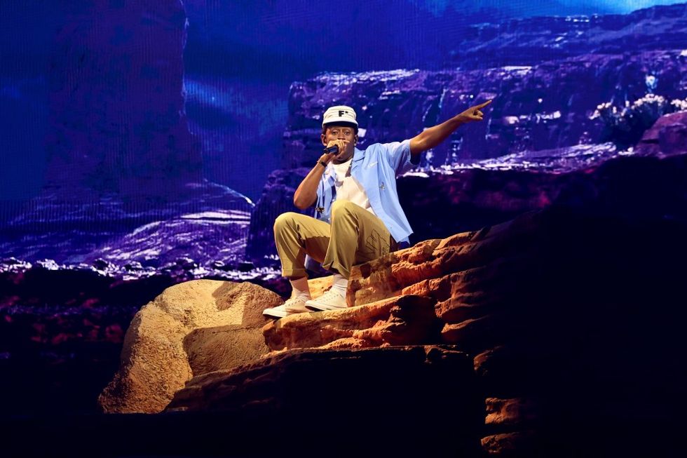 “These are Epstein hours!” exclaimed the 33-year-old rapper at the start of his set, which he began at 11:40 p.m. on the dot. The stage was set to resemble a campsite outside of the scenic Monument Valley. Dressed as a state trooper, Tyler opened the show by cooking fried eggs inside his makeshift camper trailer, before ejecting himself through the wall. (He raps, he sings… he even does his own stunts!)