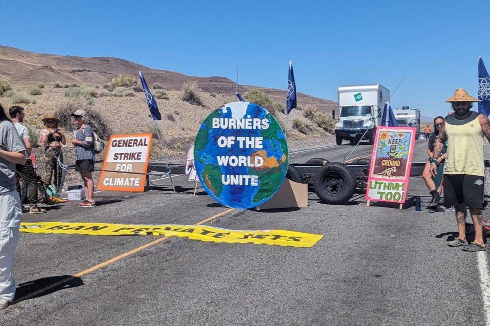 That August morning, Diacono and Collins are preparing to be the obstacle. Joined by a handful other activists from Extinction Rebellion and Scientists Rebellion, and operating under the umbrella name Seven Circles, the crew plans to block the road leading to Burning Man with a trailer bed, forcing eager Burners to reckon with one last bit of reality before their week of revelry: The planet is on fire, and they — the elites — are the reason why. “Abolish capitalism!” read the other signs, making Seven Circles’ diagnosis of the climate crisis clear. “De-growth now!”