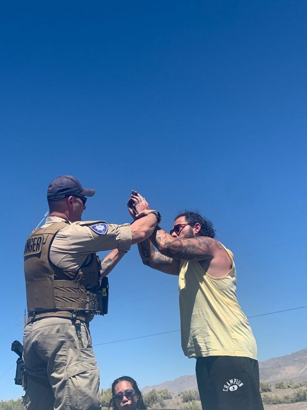 Minutes later, two Pyramid Lake Rangers wail to the scene, dust clouds blossoming behind their trucks. Suddenly, one plows through the activists’ barricade, narrowly missing Chong as the other activists scream in terror. Wheeling around, bumper dangling, he comes back for a second pass. “I’m going to take all of you out,” a disembodied voice from within the truck’s cabin drones. “You better move.”