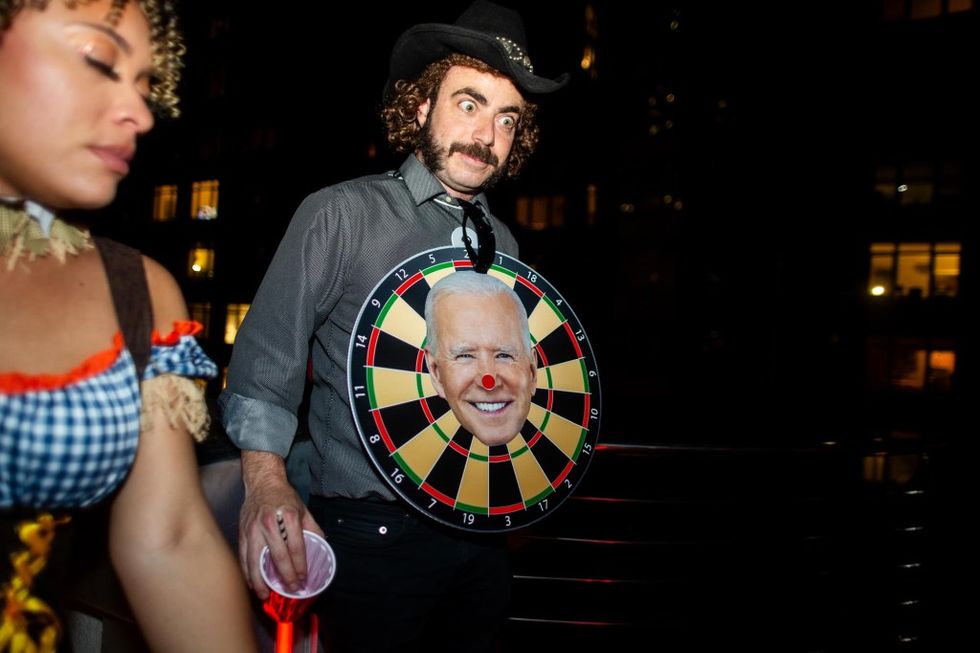I have at least a dozen interactions like this while hanging out with the NYYRC. At the group’s “MAGAween” party in late October, I overhear a woman wearing a “Make America Cowboy Again” shirt having an impassioned discussion about the Arizona recount in 2020 with someone in a Mormon-missionary outfit. A guy walks past wearing a dartboard with a picture of Biden’s face. At one point, when I’m talking to partygoers about what they like about Trump, I push back on an assertion that his tax policies were a great boon to the working man, as he slashed the corporate tax rate and gave other breaks to the wealthy. “You sound like you’re reading from a script,” a woman says to me, narrowing her eyes.