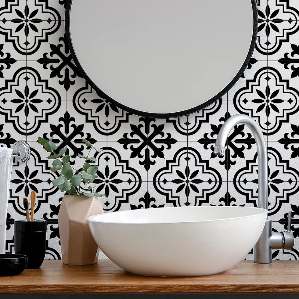 There’s such a trend for vintage tiles right now and the Regency-era of Bridgerton was all about intricate designs and bold colors. These black and white tiles are such a classic pattern and the peel-and-stick application makes them so easy to use.