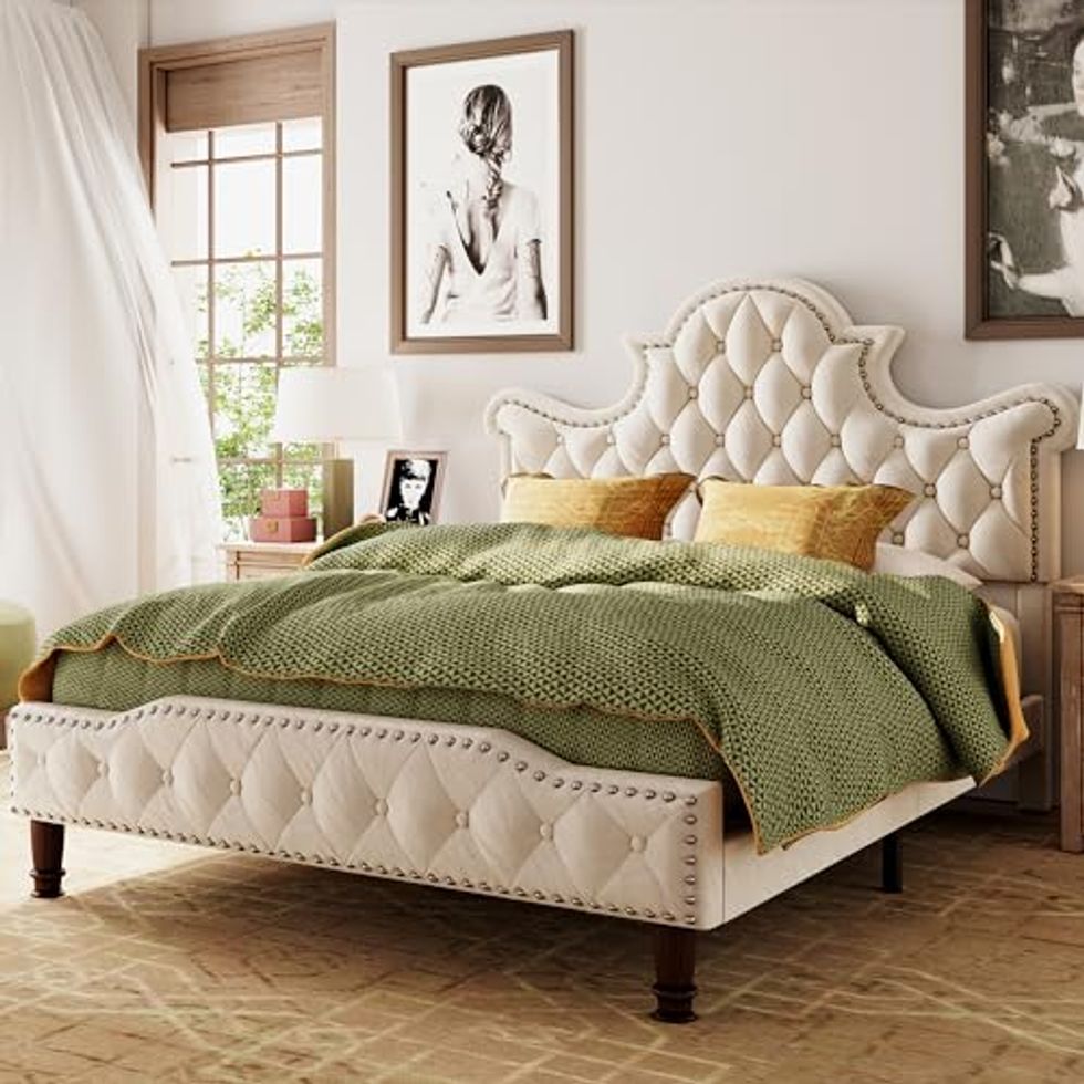 This elegant bed frame transforms your bedroom into a palace fit for royalty. The tufted headboard is handmade, and there’s ample storage space under the bed for spare bedding, clothing, or accessories.