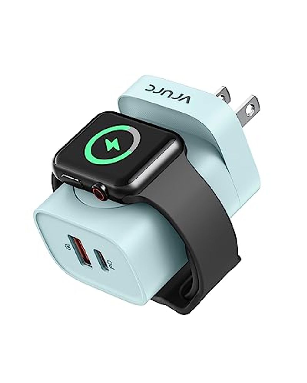 Take just one charger with you that can power up your smartphone and your Apple Watch at the same time. This cordless Apple Watch charger is compatible with iPhones, Samsung, Android devices, and tablets. Its foldable plug design makes it easy to carry without taking up much space or scratching your other items.