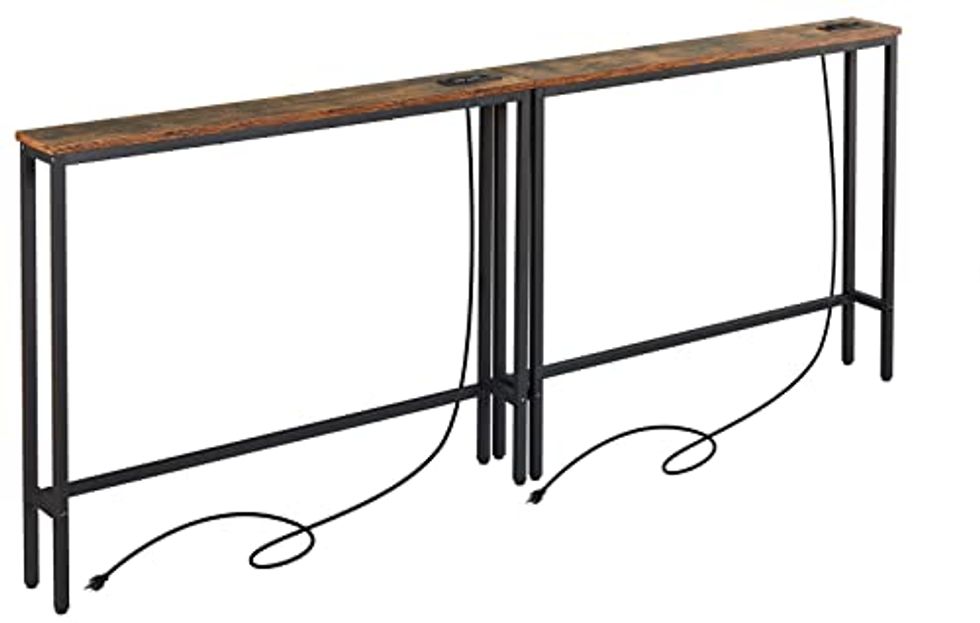 The narrow console table is designed to fit in tight spaces and offers multiple charging ports, providing functionality and convenience.