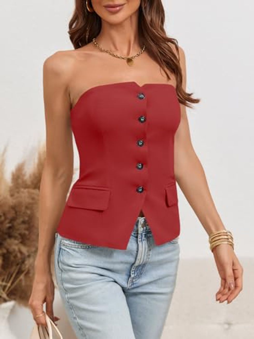 Achieve a professional look with an edgy touch when you slip into this strapless blazer vest. Although it looks expensive, this sleeveless top is affordable and can be paired with anything from trousers to shorts.